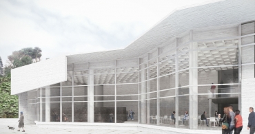Desde el frente urbano. El nuevo Museo aparece como una pieza de arquitectura que evoca las fortalezas de piedra construidas por los españoles en el siglo XVI. Entre la opacidad de los contrafuertes propuestos, emerja una roca de cristal de geometría quebrada, que derrama sobre el río su resplandor y revela un interior de muros, pilares y rampas de hormigón a la vista que protegen tras las paredes blancas y quietas para la exhibición.